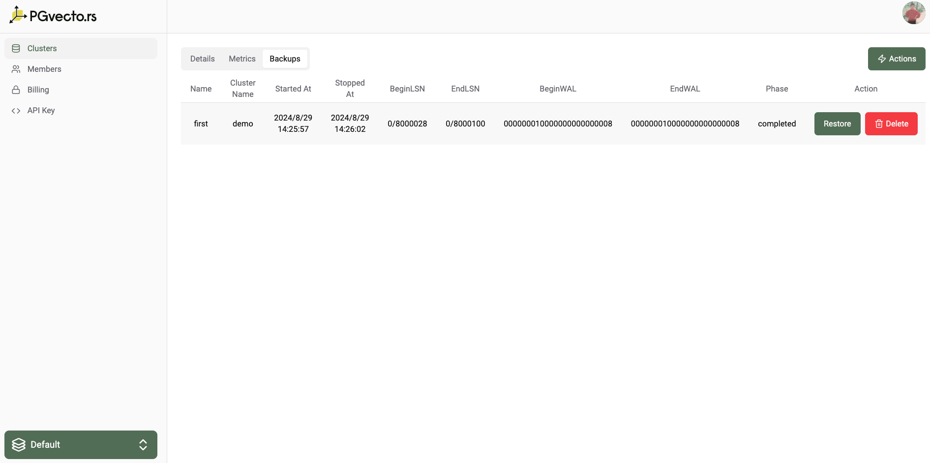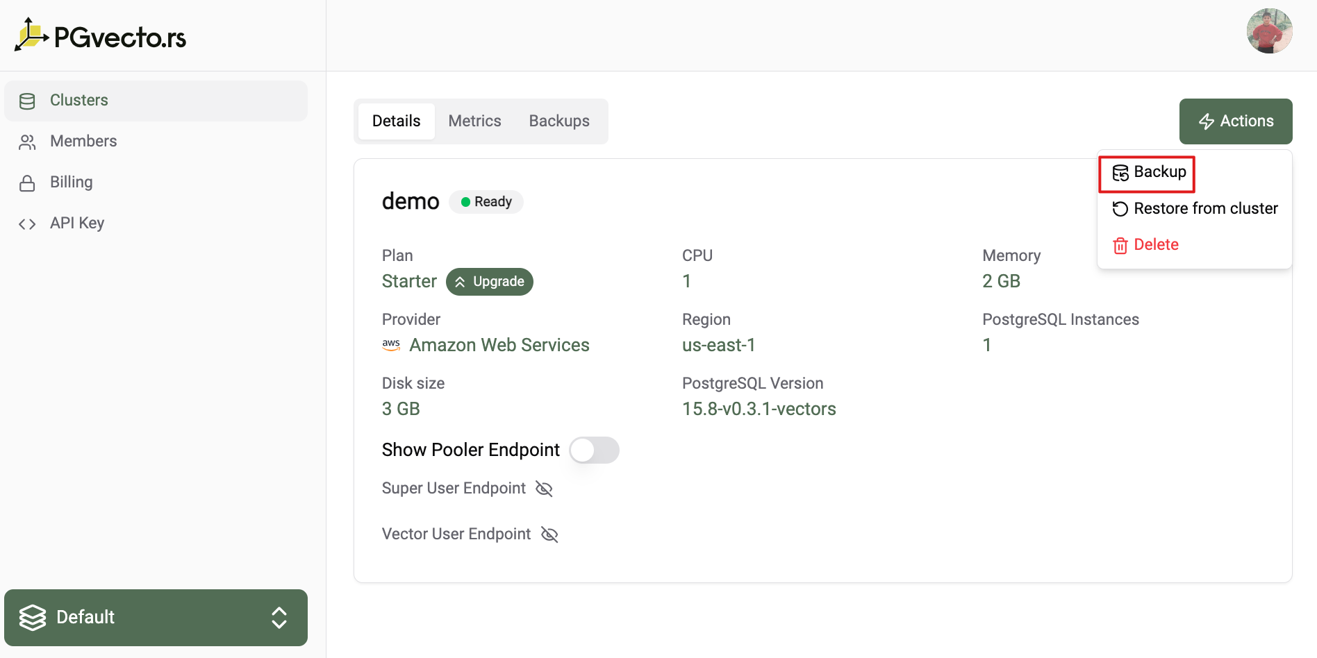 Once the cluster is created, automatic backups are enabled by default. Automatic physical base backups are taken daily and retained for 7 days. The backups are stored in AWS S3, and the retention policy for AWS S3 is set to 90 days.