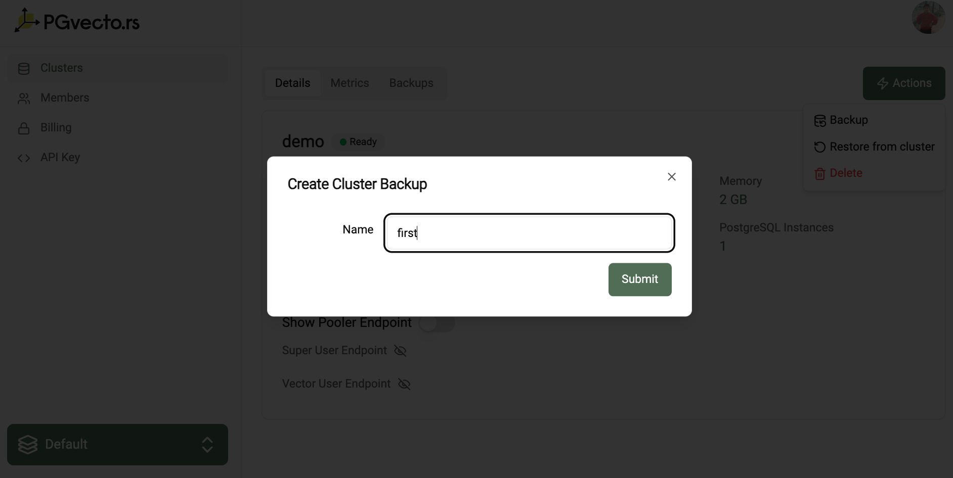If you want to create a backup at a specific point in time, you can create an on-demand backup. On-demand backups are physical base backups of the database cluster and retained for 7 days. They are stored in AWS S3 and can be retained for up to 90 days.